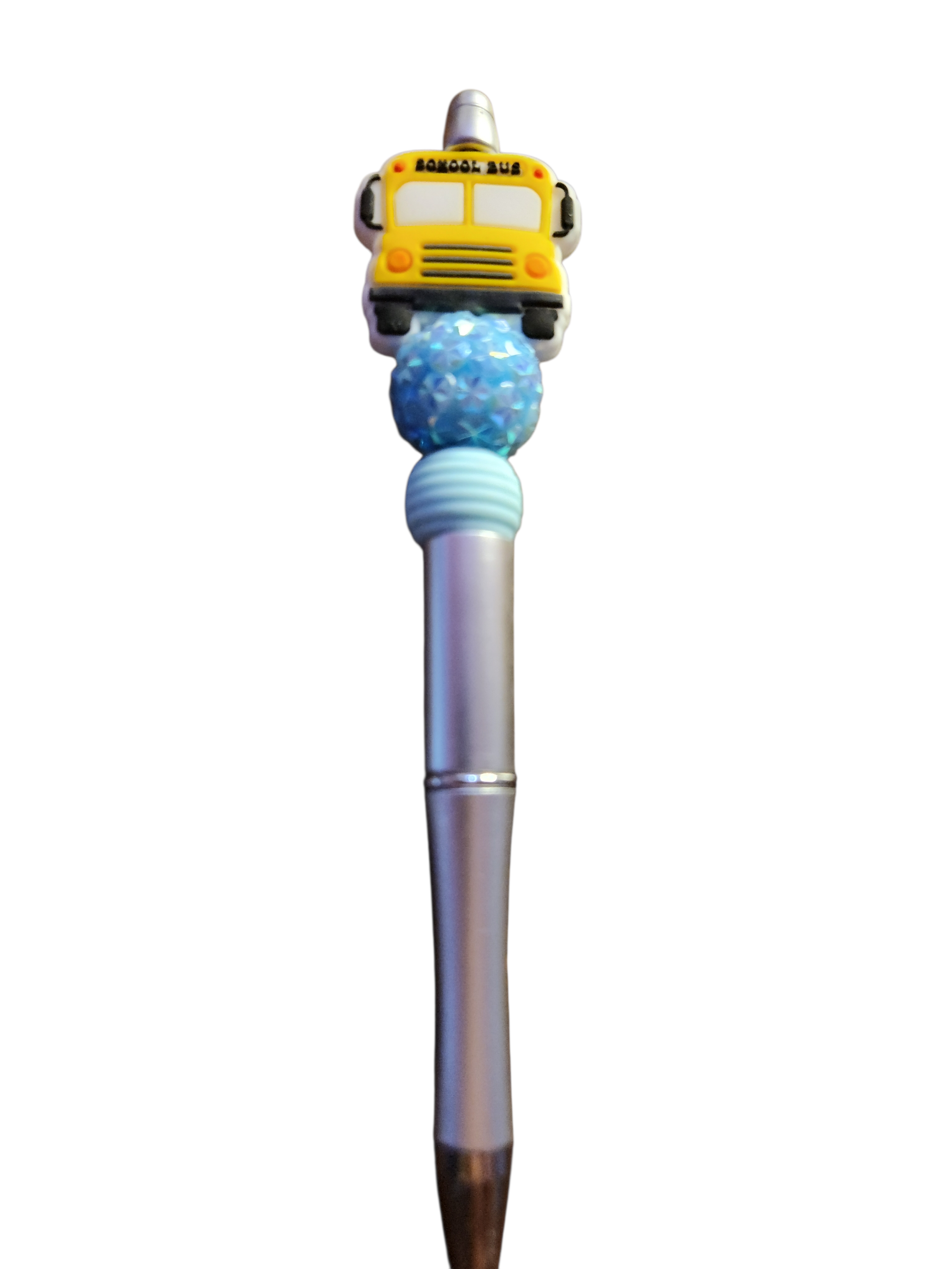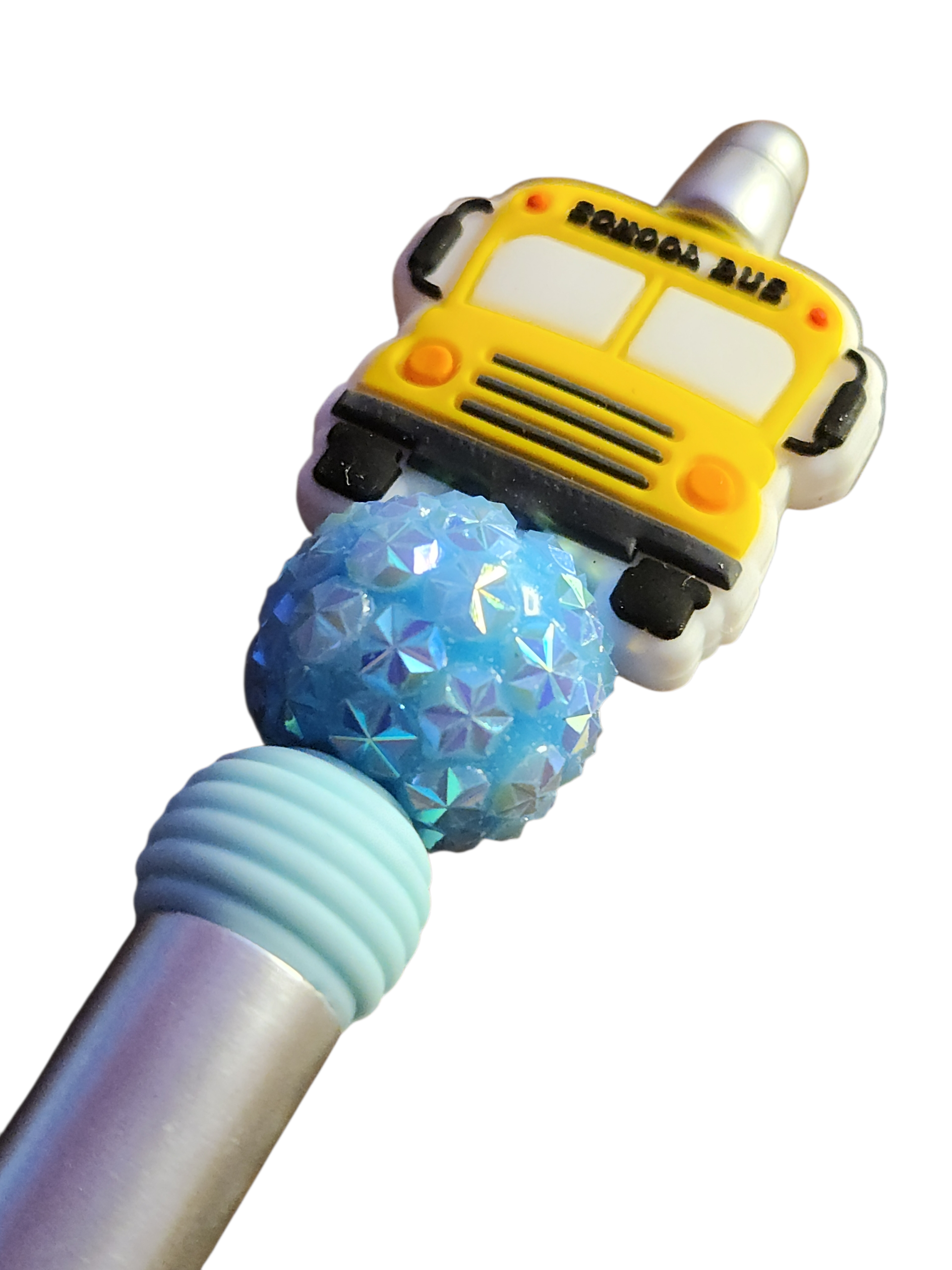 - Unique Design: Features a detailed silicone school bus charm paired with a large, glittery light-blue rhinestone bead and a coordinating ribbed spacer bead.