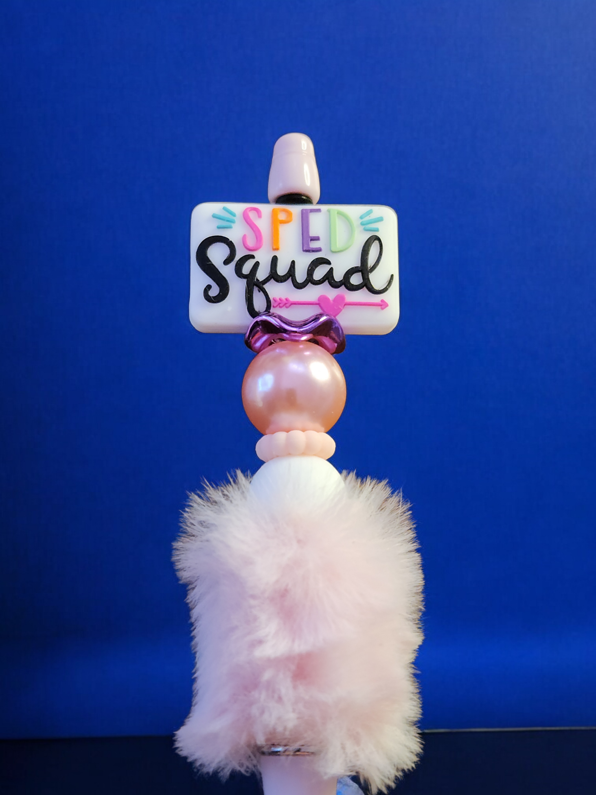 Featuring a vibrant "SPED Squad" focal bead, a metallic purple bow, and a shimmering rose-gold pearl, this pen is finished with a luxurious pink faux-fur pom for a unique, soft-touch writing experience. It’s the perfect gift for teachers, paraprofessionals, and therapists!