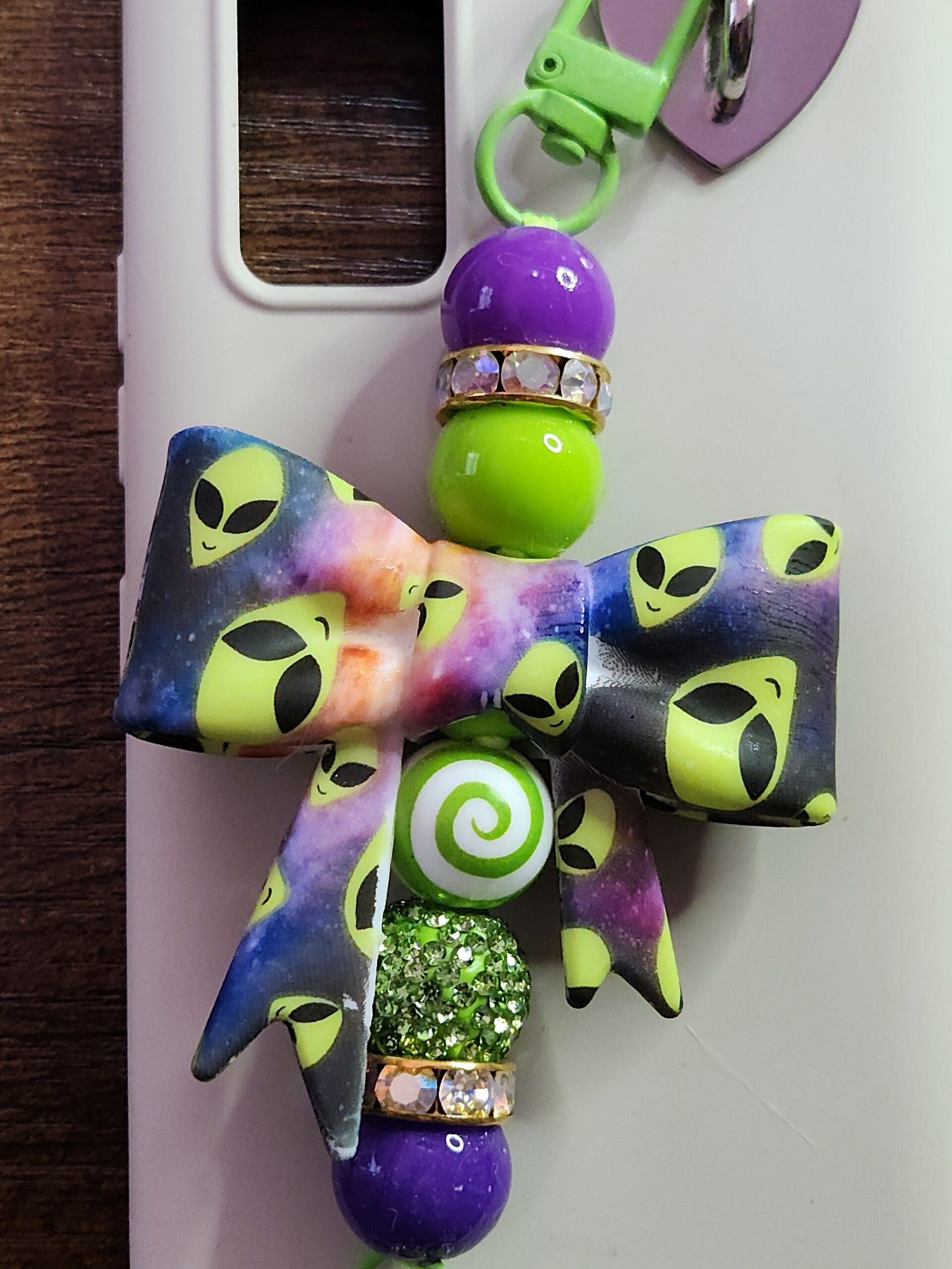 Elevate your tech aesthetic with our vibrant, alien-themed interchangeable phone strap. Designed for those who love a mix of "space-age chic" and playful whimsy, this strap features a stunning galaxy-print bow adorned with neon green alien faces and a curated selection of galactic beads.