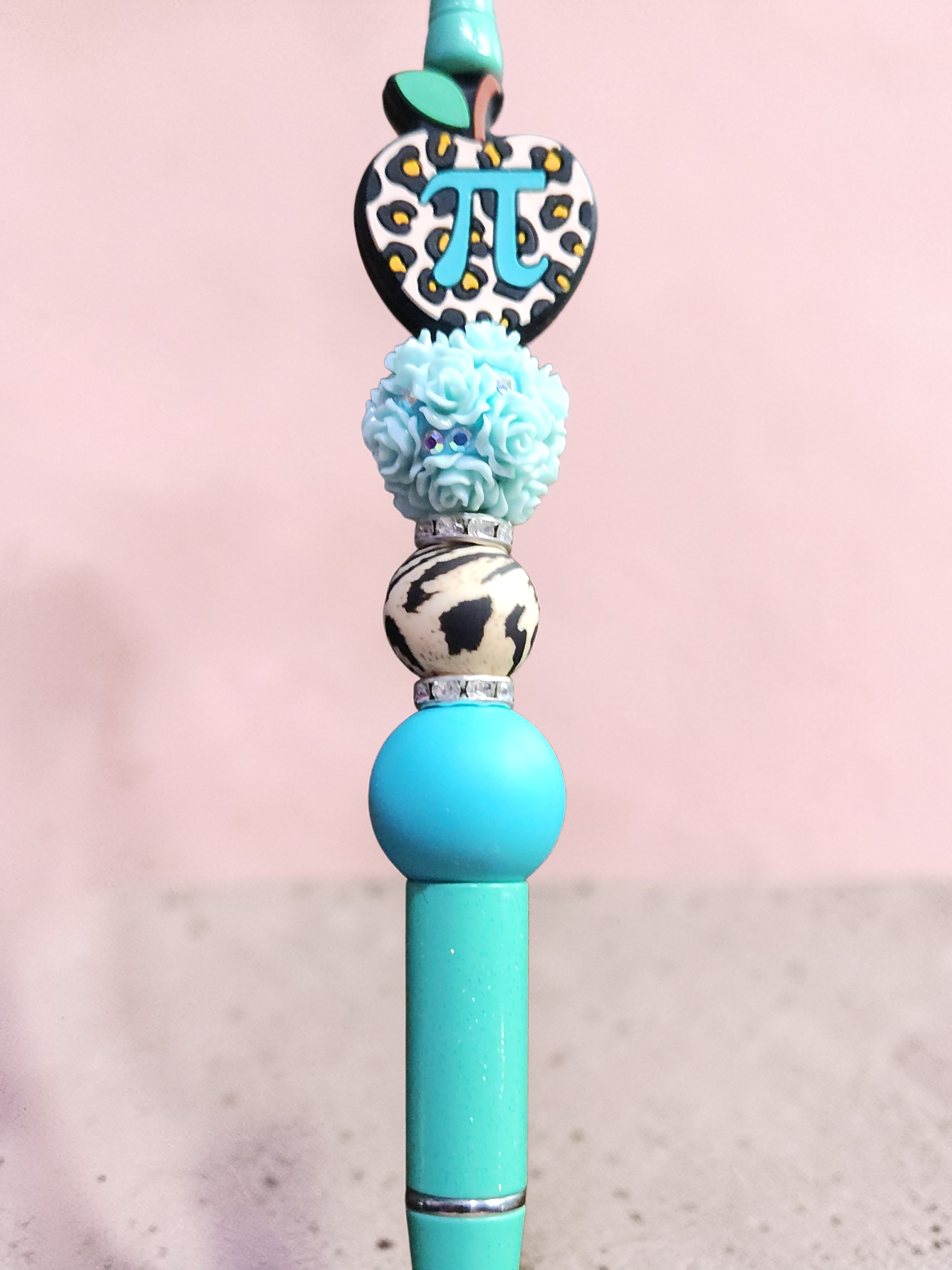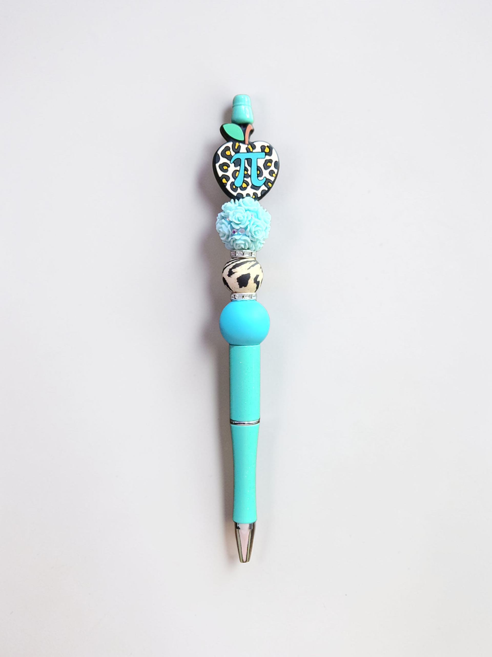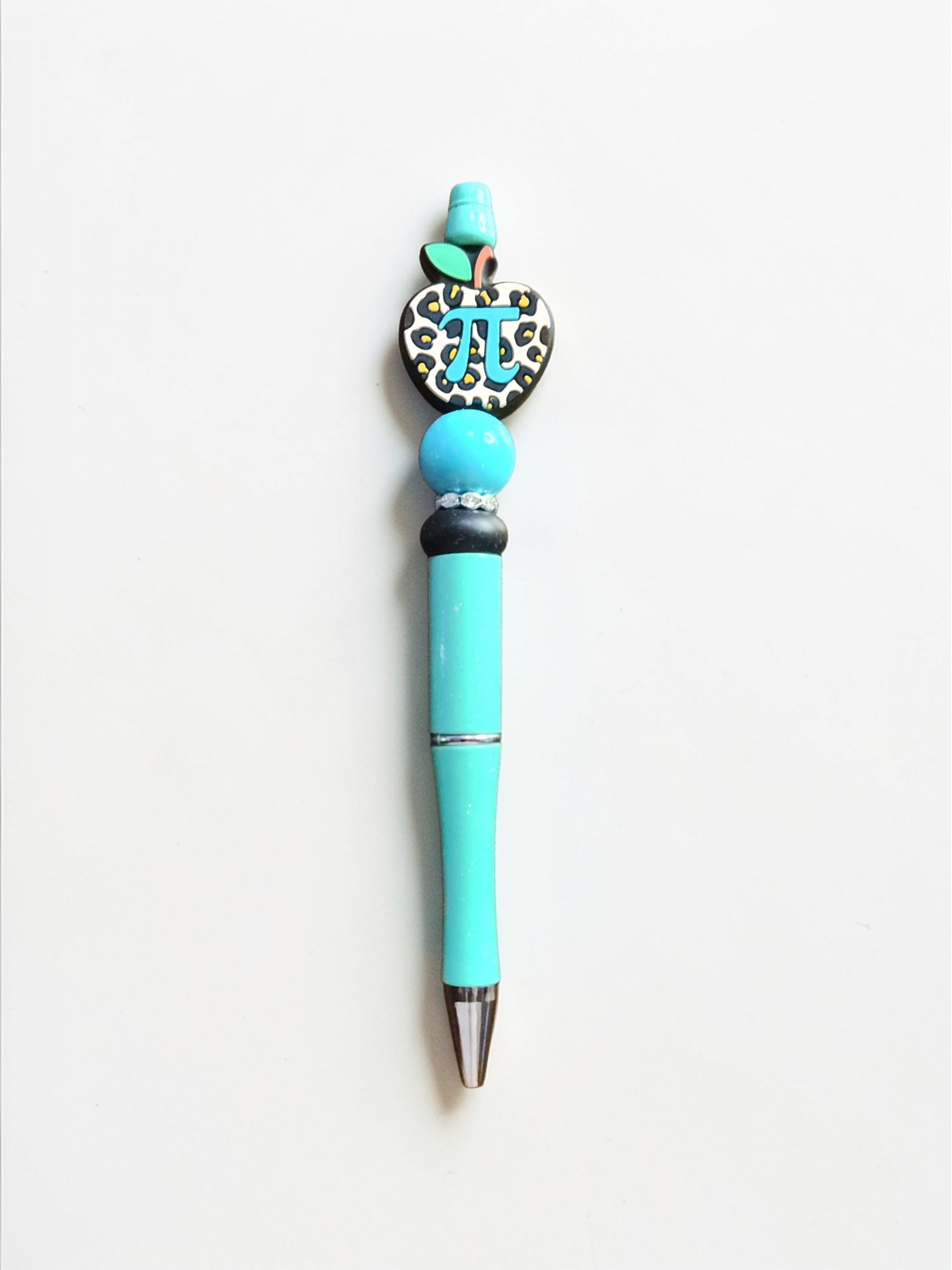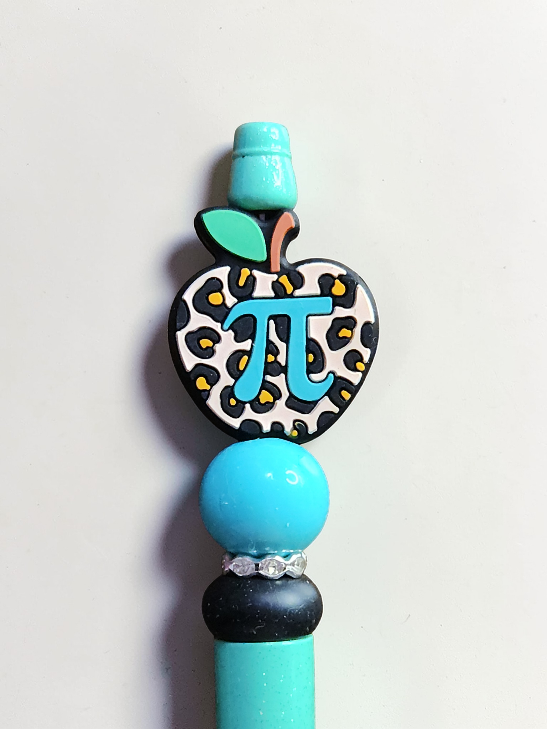 Add a touch of mathematical flair to your stationery collection! This custom beadable pen features a trendy leopard-print apple focal bead with a bright teal \pi (Pi) symbol, making it the perfect accessory for math teachers, students, or anyone who loves a good pun and a pop of color. With high-quality silicone and sparkling rhinestone accents, this pen isn't just a writing tool—it’s a statement piece.